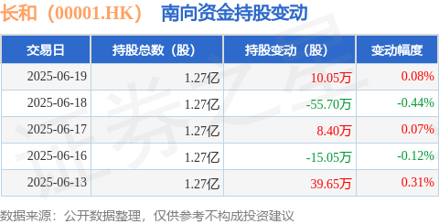 长和(00001.HK):6月19日南向资金增持10.05万股